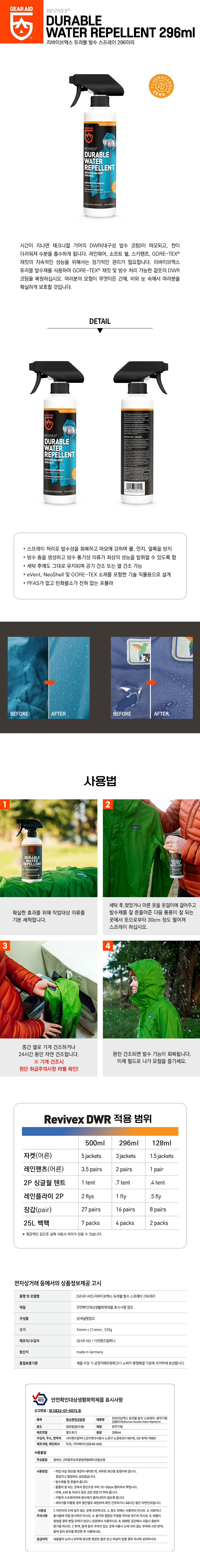 | »óǰ¸í : [Revivex] Durable Water Repellent / ¸®¹ÙÀ̺꿢½º µà·¯ºí ¹ß¼ö ½ºÇÁ·¹ÀÌ 296¹Ì¸® | | Á¦Á¶È¸»ç : GearAid